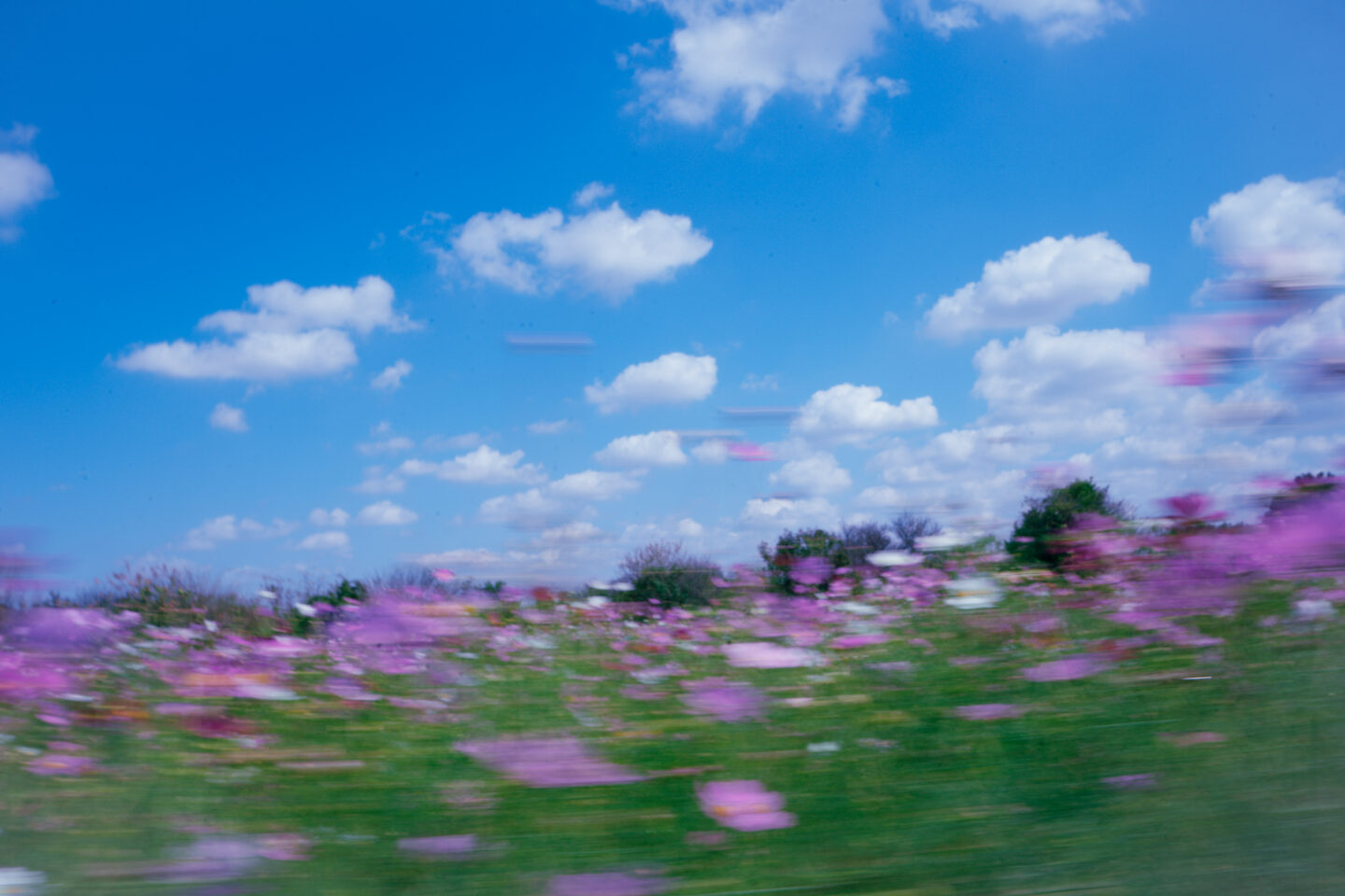 高原で走る車の助手席から撮ったふうに見えるが、これ実は30mmのレンズで思いっきり絞ってシャッタースピードを遅くし、カニ走りして手前のコスモスを流している。人が少ない近所の畑ならではの撮影方法。青空に綺麗な形の雲があるとこれをやりたくなる。28mm付近のレンズだと印象的なコスモスはなかなか撮りづらいと思うが、はまるとお気に入りの一枚が撮れると思う。