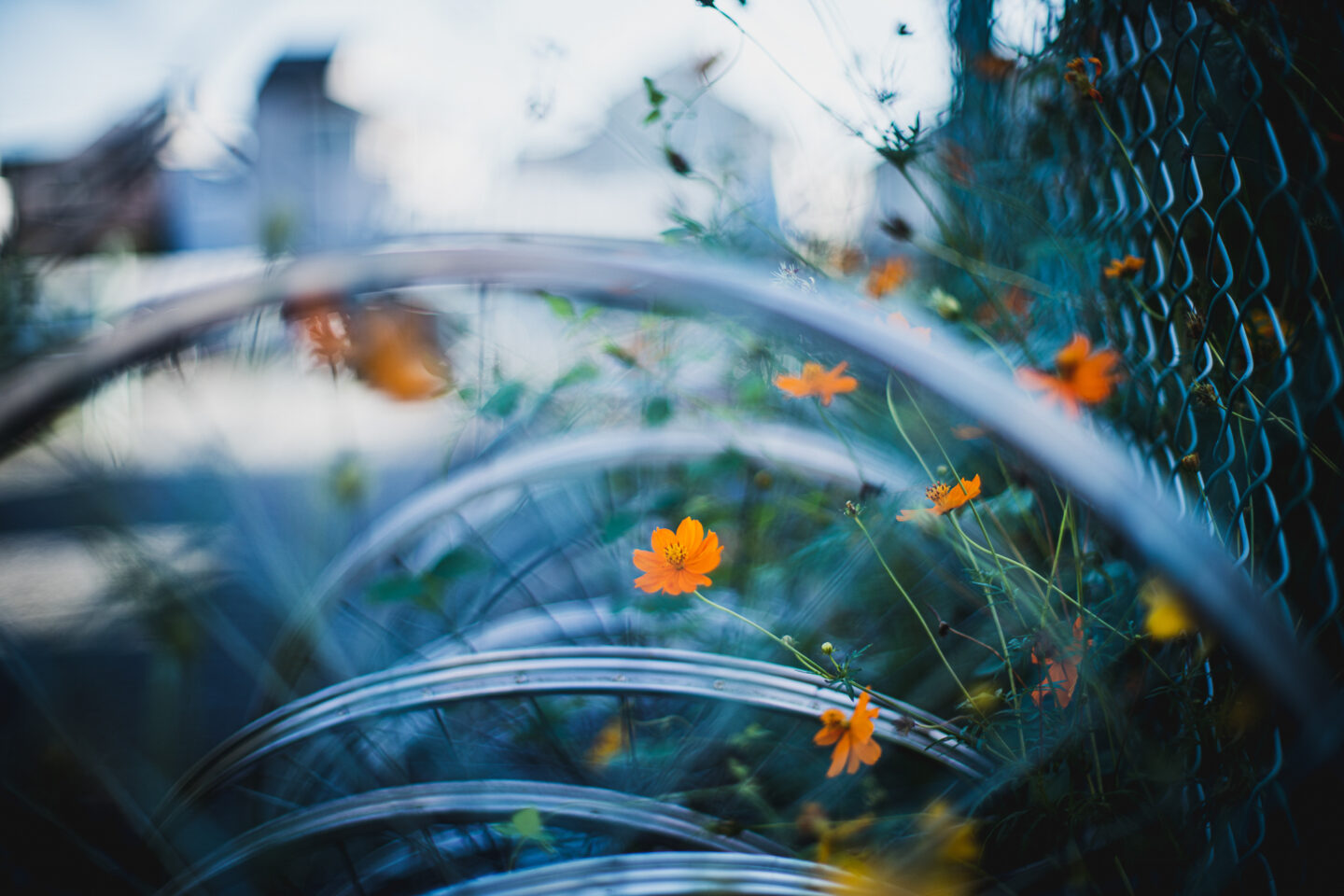 花が少ない夏の終わり間際に、いい被写体となるのがキバナコスモス。花畑で撮るのも良いが、このように捨てられているものとの組み合わせを見つけると撮らずにはいられない。前に柵があるので明るい望遠で狙ってみた。花に規則性がなく正解がなかなか見つからない場面だったが、手前に大きく車輪を入れることによって少し枠効果が出て、おさまりの良い写真となってくれた気がする。