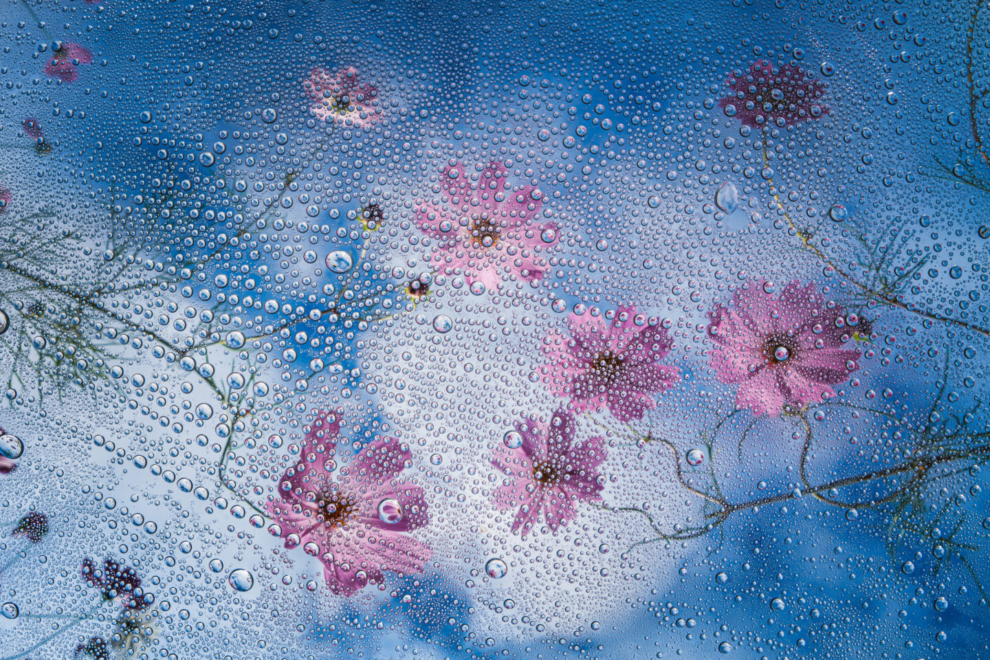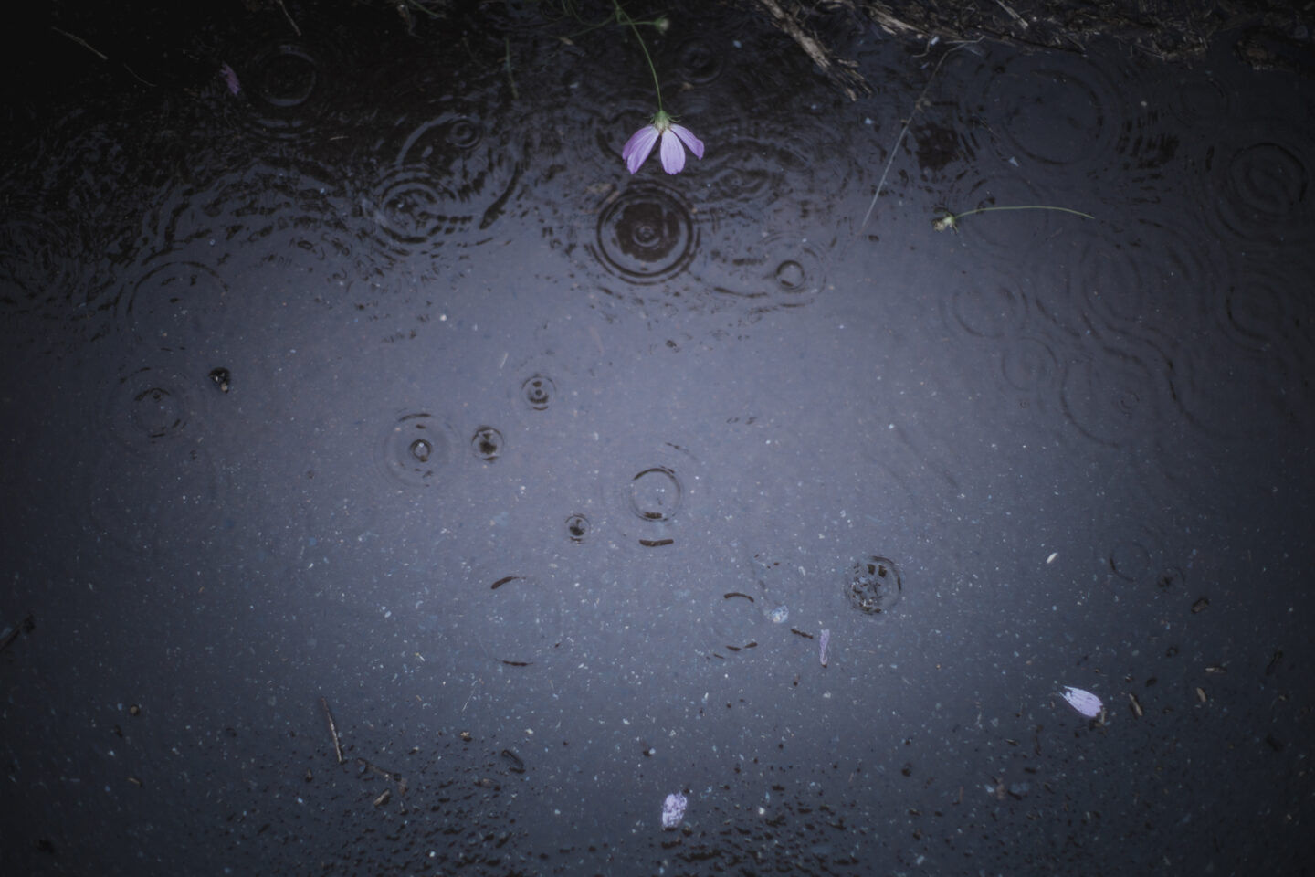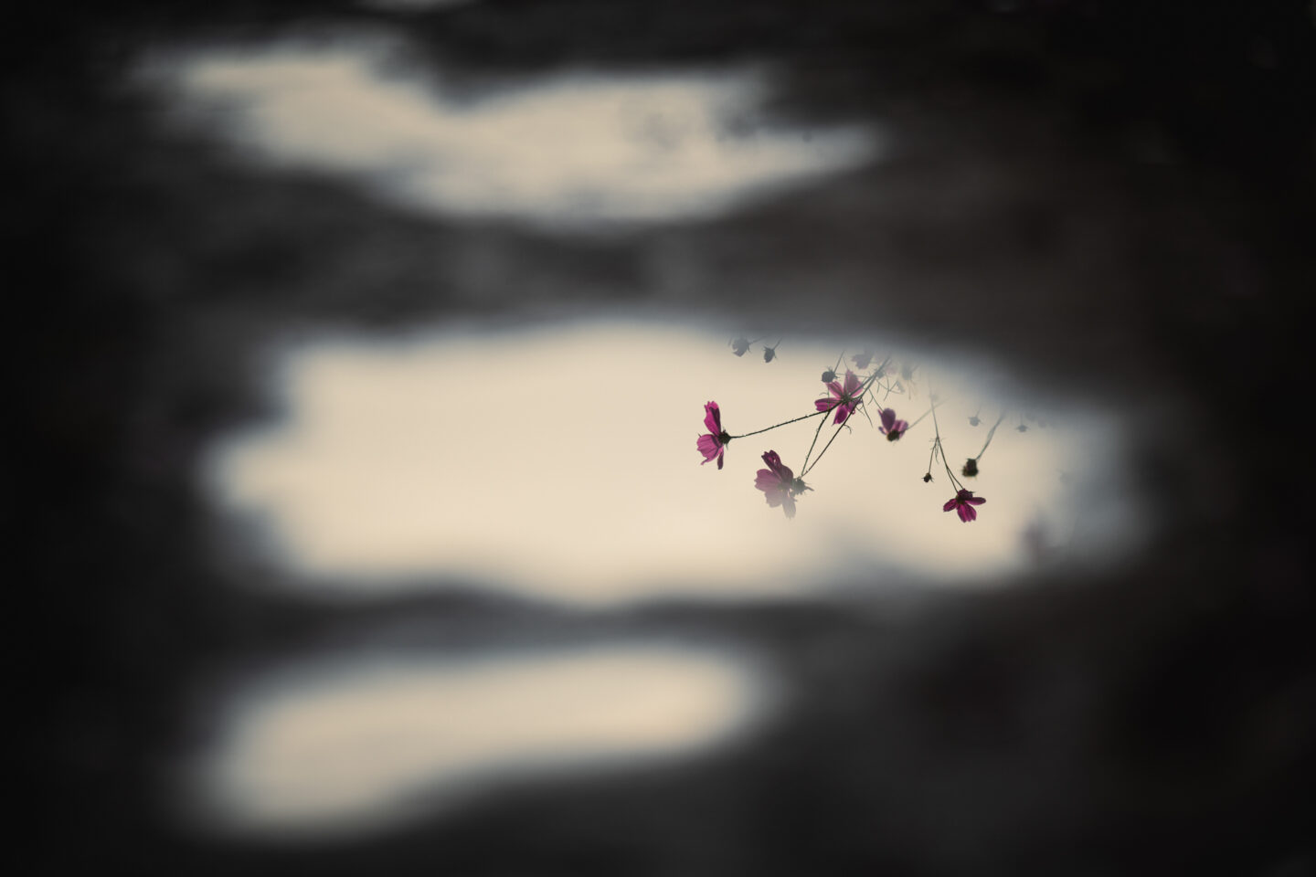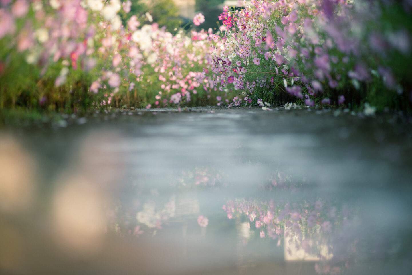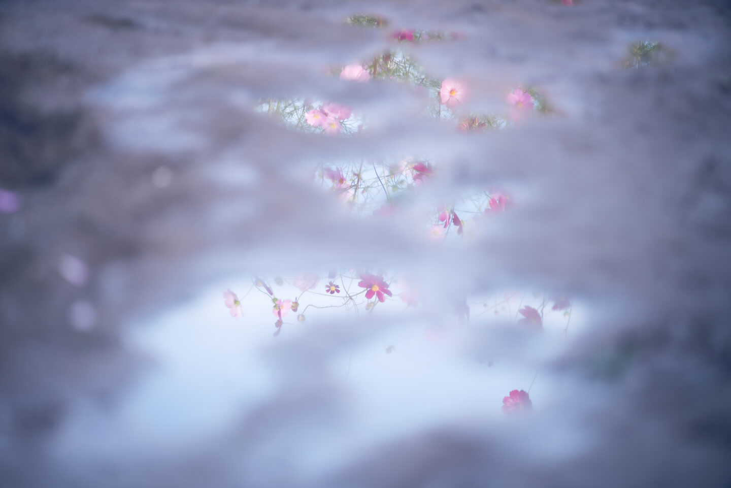 コスモス撮影の一番の条件と言えば雨上がりの朝。キラキラした水滴も撮れるが、このように水溜まりにだけレンズを向けた撮り方もある。大きな水溜まりだと狙いがわかりづらいが、このように小さい水溜まりが沢山あると、ここにこの花入れてとか想像力が膨らんでいく。もっと追い込めたとは思うが、こんな感じで落ち着いた。