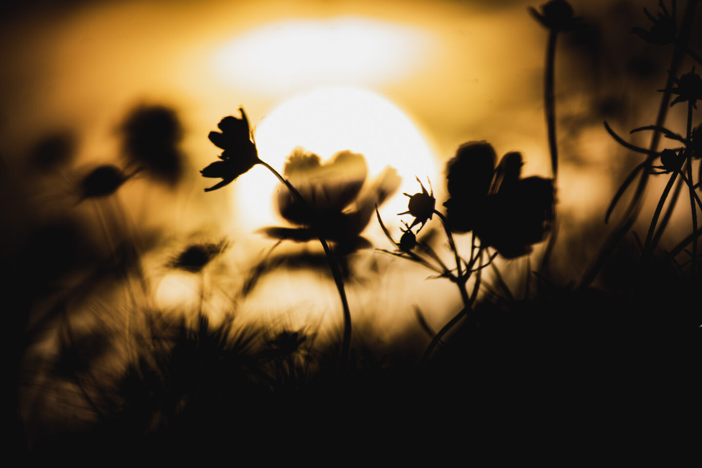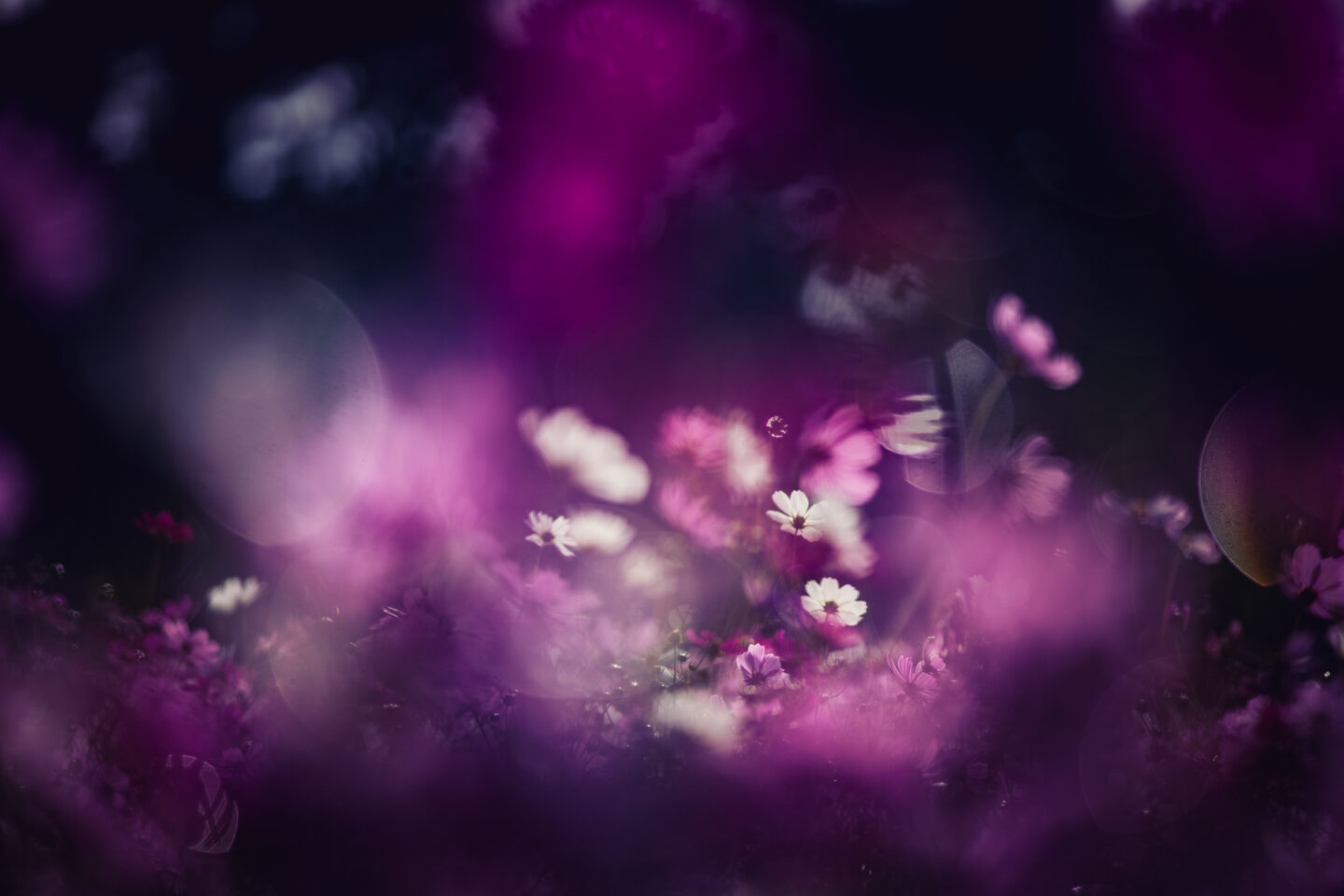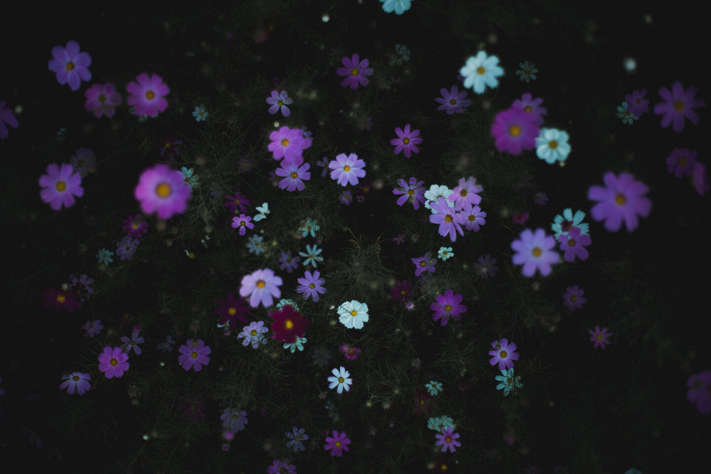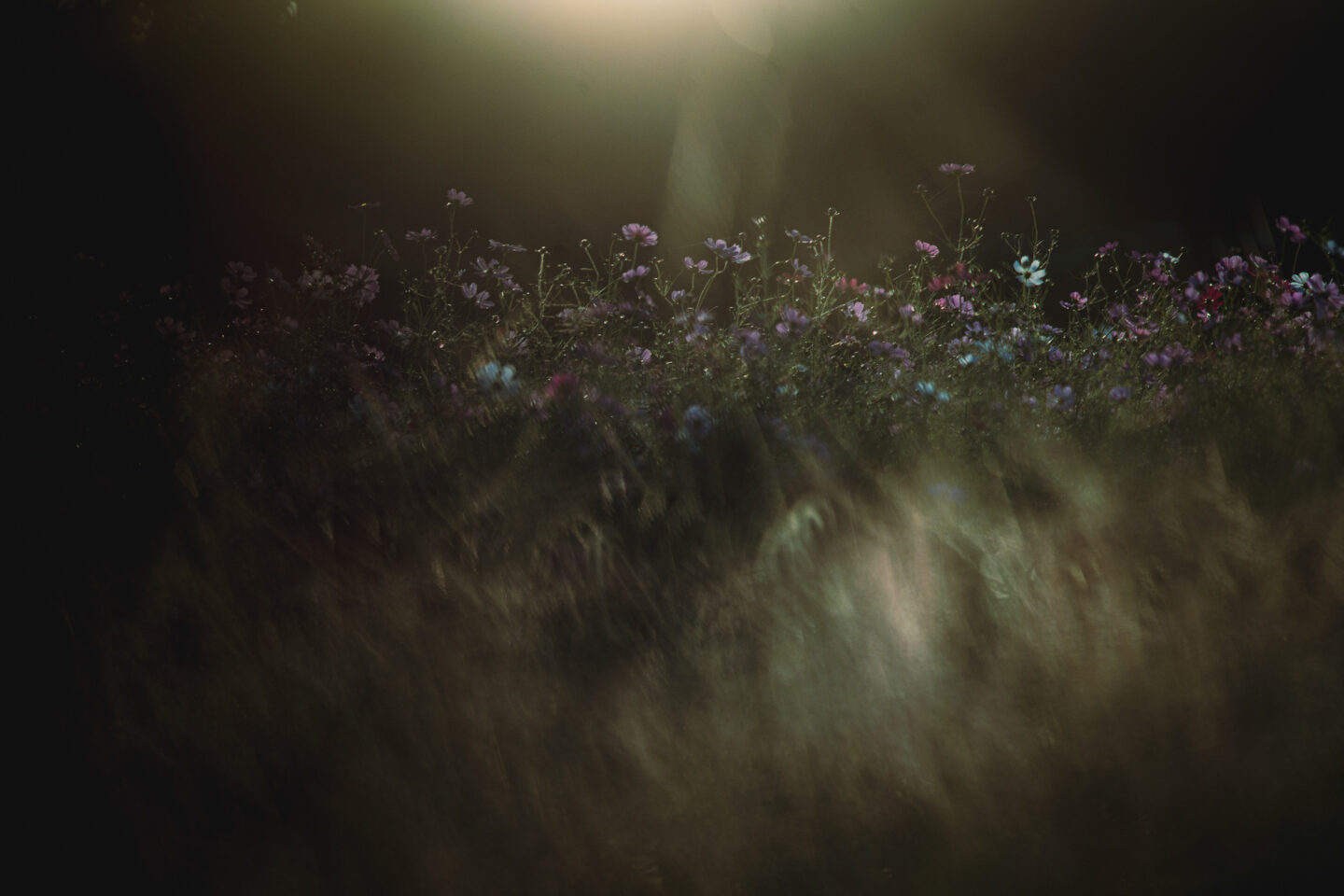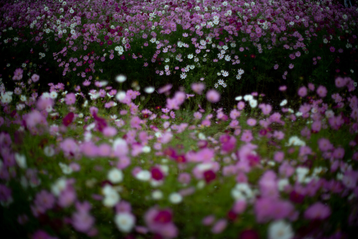 夜や夕方の暗い時間に真上から密集しているコスモスを撮ってみた。広角だと周辺に歪みがでてきておさまりが悪くなるので50mmの明るいレンズで。マニュアルフォーカスレンズなので、カメラを上下にずらしながら構図を選ぶ。暗い時間に撮るのは花だけを浮かび上がらせたいからだ。