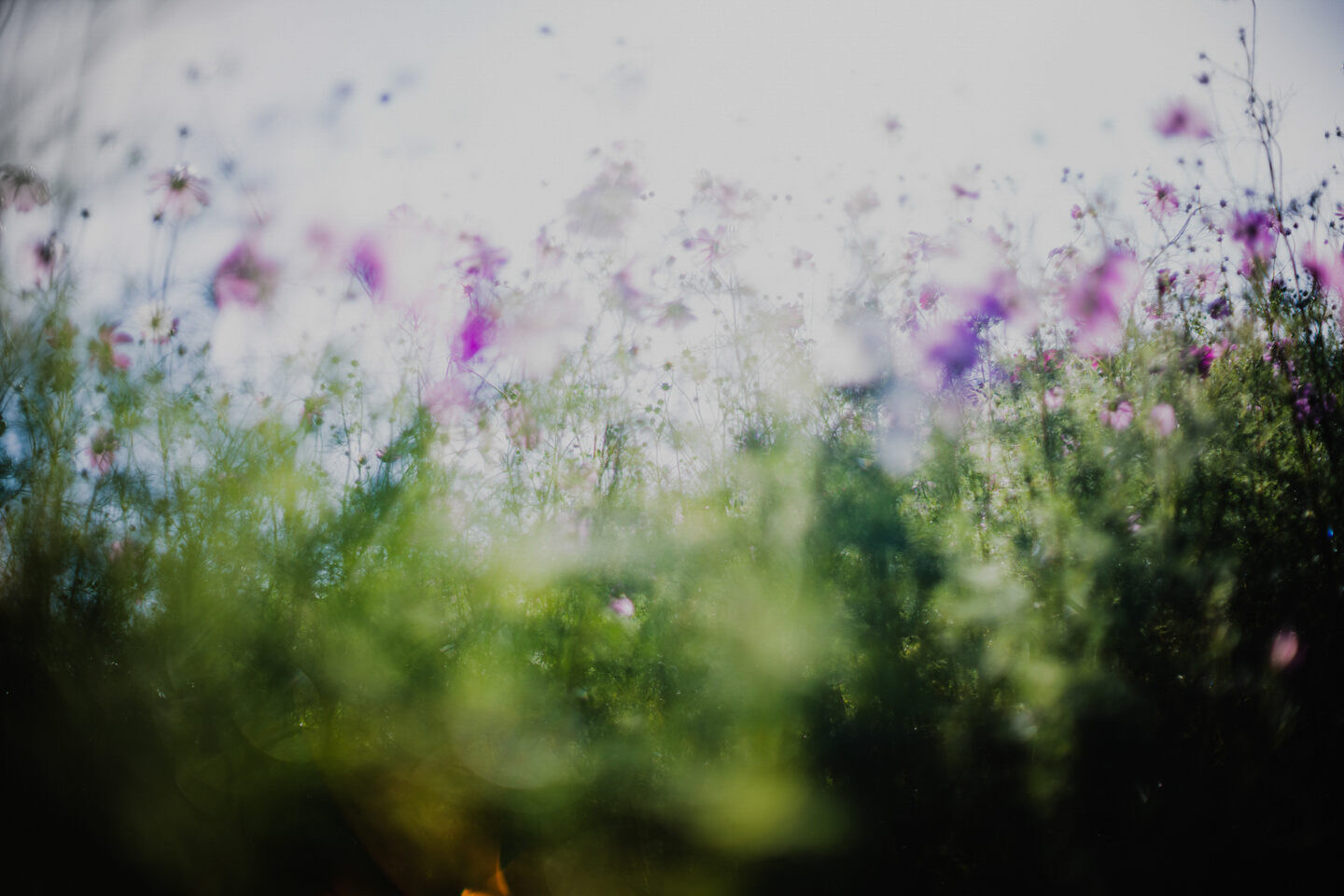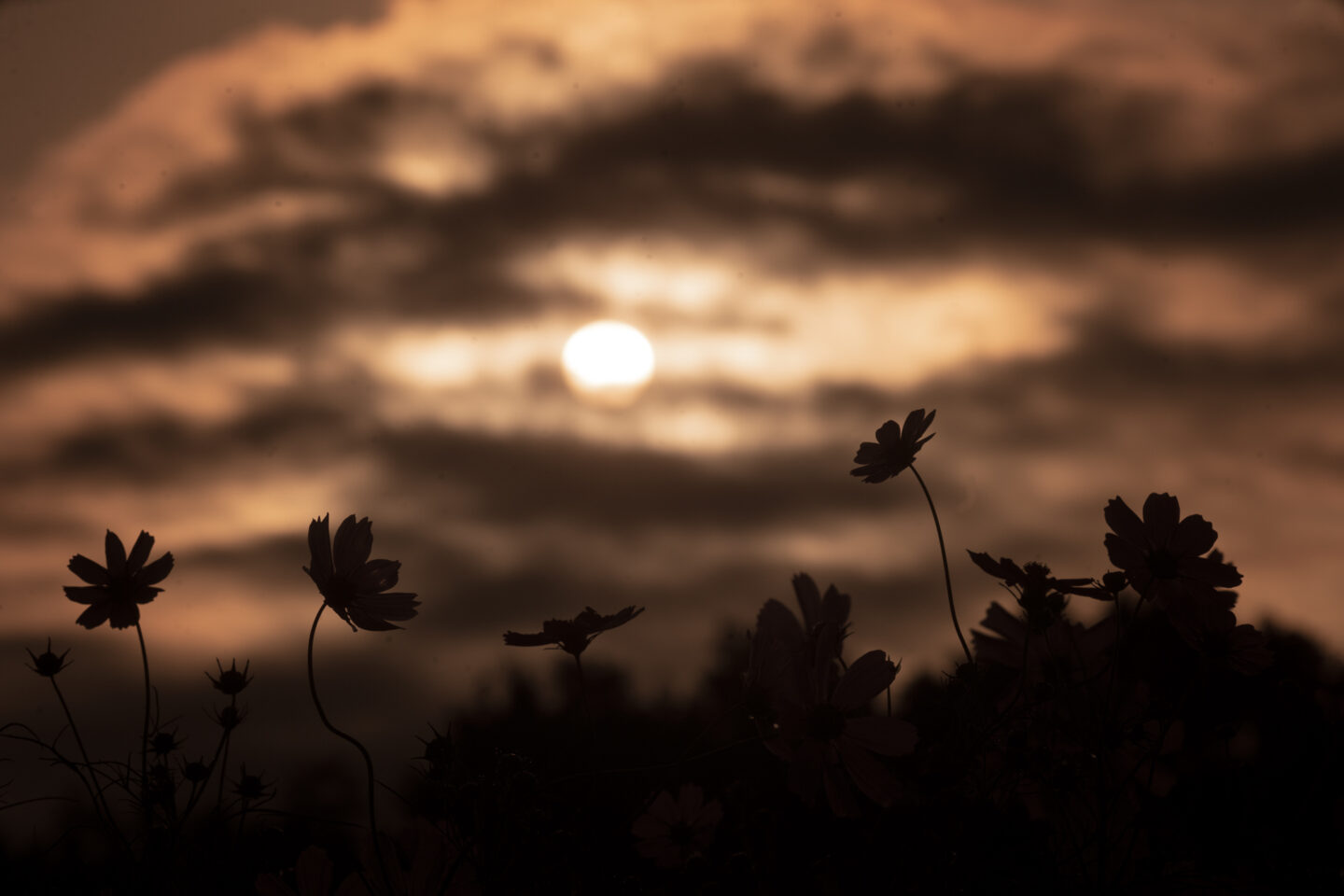この場所はコスモス畑から少し離れた雑草の中。日の出の一番良い時間はコスモス畑に集中してしまうところだが、少し落ち着いて周りを見渡すと、このようなめったに見られない光景に出くわすことがある。昼間だと絵にすることは非常に難しいが、逆光になると話は別。猫じゃらしをシルエットにして、コスモス一輪を引き立たせる。画面上部の淡い光はフードの先で太陽の光をぎりぎりのところで切って、こんなふうに写るよう調整している。なかなか見慣れないコスモス、こちらもお気に入りの一枚となった。