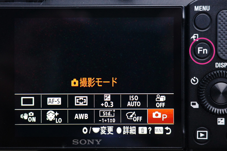 大きく異なるのはファインダーがないこととボタン類の操作面で、ボディ外装に撮影モード切替ダイヤルがないため、撮影モードの切り替えやホワイトバランス、ドライブモード、AFモード、測光モード、露出補正などよく使う機能は、背面のFn.ボタン(ファンクションメニュー設定)に割当てて使います。