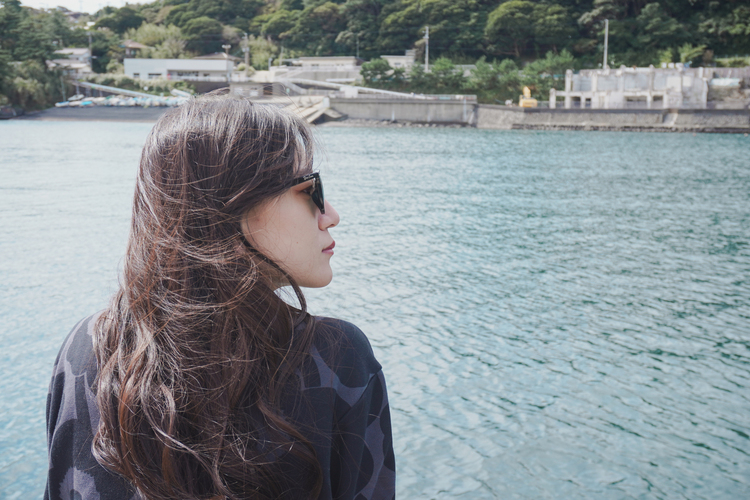 この日は久しぶりに足を延ばして伊豆大島へ。最近ドラマの舞台にもなった小さな港町波浮(はぶ)を訪れ、同行していた友人たちと散策スナップ撮影を楽しみました。ほどよく背景を取り込める距離で静かな港を背景に横顔で一枚。風になびく髪を繊細に写し出しています。