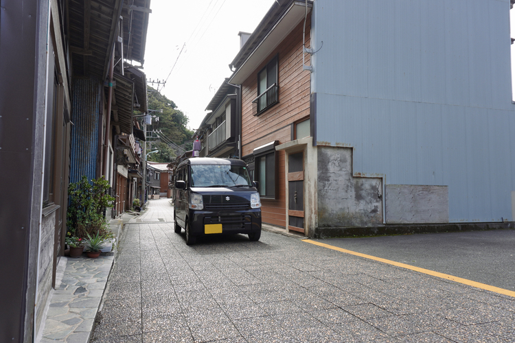 木造家屋が並ぶ路地では、奥行きを強調できる広角端16mmでパースを活かした迫力ある一枚に。すっきりとした印象の描写です。