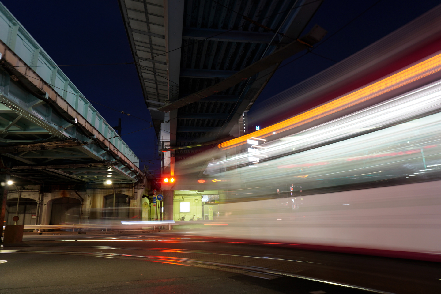 長秒撮影で路面電車が目の前をすり抜けていく瞬間をキャッチ。
