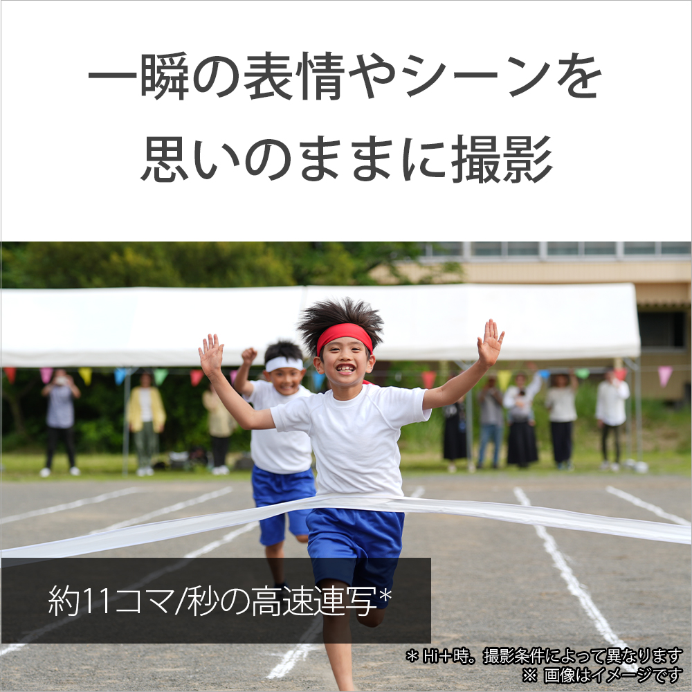 イメージセンサーの撮像領域のほぼ全域に、最大759点の像面位相差AF点を配置することで、高精度かつ滑らかなフォーカスが可能。カメラまかせで被写体を自動で追い続ける「リアルタイムトラッキング」を搭載し、顔検出精度も向上。動画も静止画もリアルタイム瞳AFが追いかけることで簡単、キレイに撮影できます。さらに最高約11コマ/秒の連写性能を備え、ベストショットを逃しません。