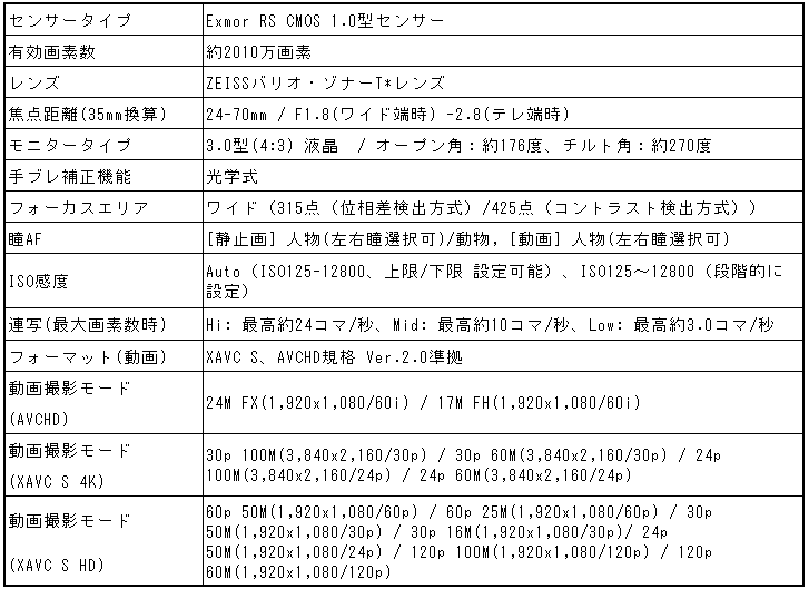 動画機能が話題になっているカメラですが、基本スペックをあらためて確認しても分かるように、AFフォーカスの測距点も425点(コントラスト検出方式)や人物・動物瞳AF、連写機能も最高で約24コマ/秒というスペックを持ち、通常の静止画撮影においてもRX100シリーズと同等の機能を有しているのが分かると思います。
