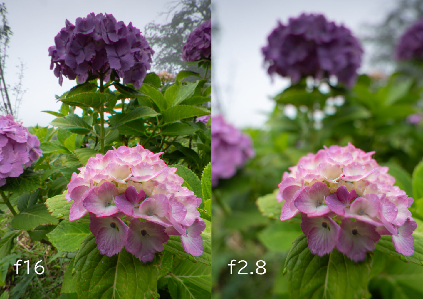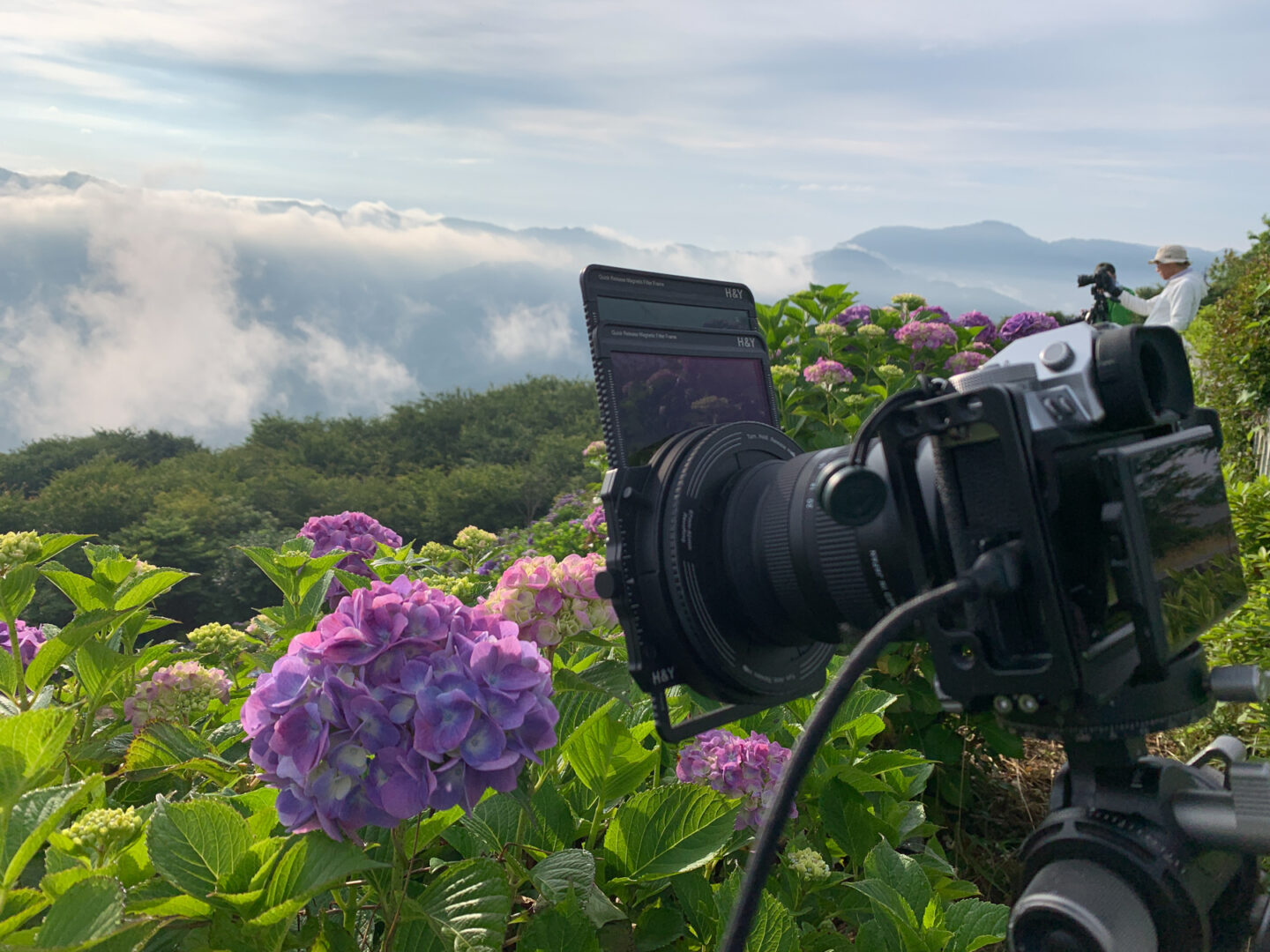 目の前にあじさいを配置し、背後には雲海。もちろんここまで近寄れば被写界深度は浅めになりますので、限りなくパンフォーカスにするためにf値を絞り込みます。通常は回折現象によって描写が甘くなることを懸念してここまで絞ることはないですが、この場合はそれよりもパンフォーカスにすることが大事。