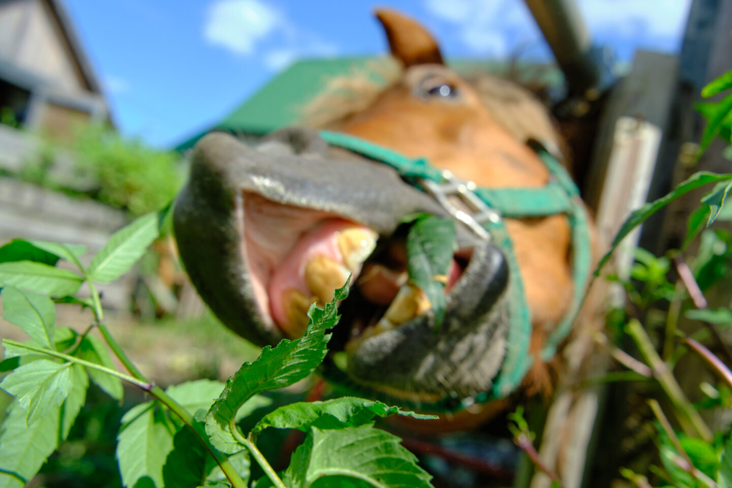 F2.8で撮影しようとしましたが、ポニーがボケ過ぎてしまいました。意図した表現にするため、F5.6で塩梅が良いボケ味を確認しながら、草を食べたくても届かない頑張るポニーを撮影しました。
