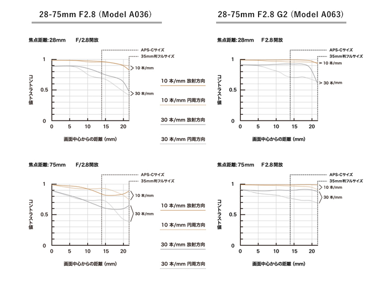 本レンズのMTF曲線を旧型の28-75mmと比較してみると、全然違っていることが分かります。グラフ上の実線が解像度を表しており、これが上にくっついているほど解像感が高いということになります。グラフの横軸が画面中心からの距離です。初代28-75mmは画面の中心から10mmあたりから解像度が落ちているのに対し、G2は画面の端でも解像度が保たれています。