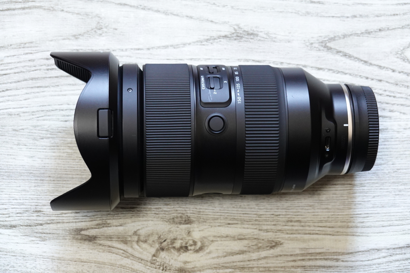 スペックのお話もさせて頂きます。届いて箱から出した時の印象は正直デカい!でした。実際、長さ158mm、幅89.2mm、フィルター径82mm、重量1,165gの本体は持ってみるとズッシリと重量感が有り、最近のタムロンのレンズは小さくて軽いイメージの物が多かったので少々驚きました。よく考えれば35mm-150mmのズームでF2-F2.8という凄く明るくて高倍率のズームレンズなので、大きくなるのは当たり前なのです。