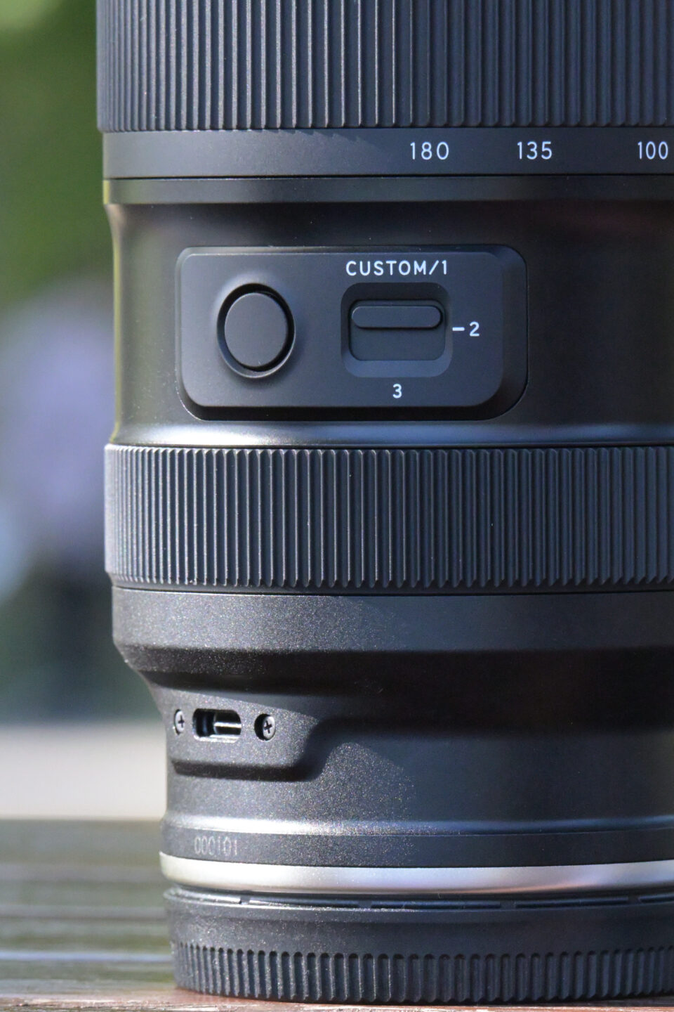 機能を割り当てることができるカスタムスイッチCUSTOM1/2/3、フォーカスリングの機能や割り当てができる丸いフォーカスセットボタンとコネクターポート(USB Type-C)がついています。コネクターポートに別売のTAMRON Connection Cableでパソコンやスマートフォンに接続し、専用ソフトウェアTAMRON Lens UtilityTMからフォーカス関連の機能を割り当てることができます。またフォーカスリングのカスタマイズや、レンズのファームウェアを最新バージョンにアップデート(PC版のみ)することもできます。