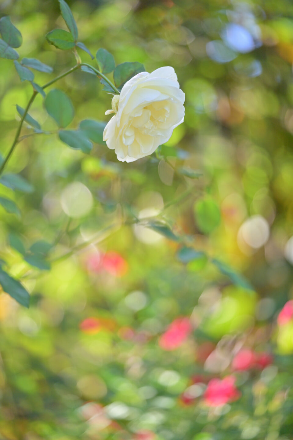 一輪のバラのすぐ後ろから、さらに奥へと様々な花や植物が咲いていました。バラにピントを合わせて離れた場所が背景になるアングルからF2.8で撮ると、周りの花や葉を大きくぼかし切り、ふんわりとカラフルなボケにすることができました。開放値が明るいレンズはいいですね。逆光で光に囲まれたイメージにしています。