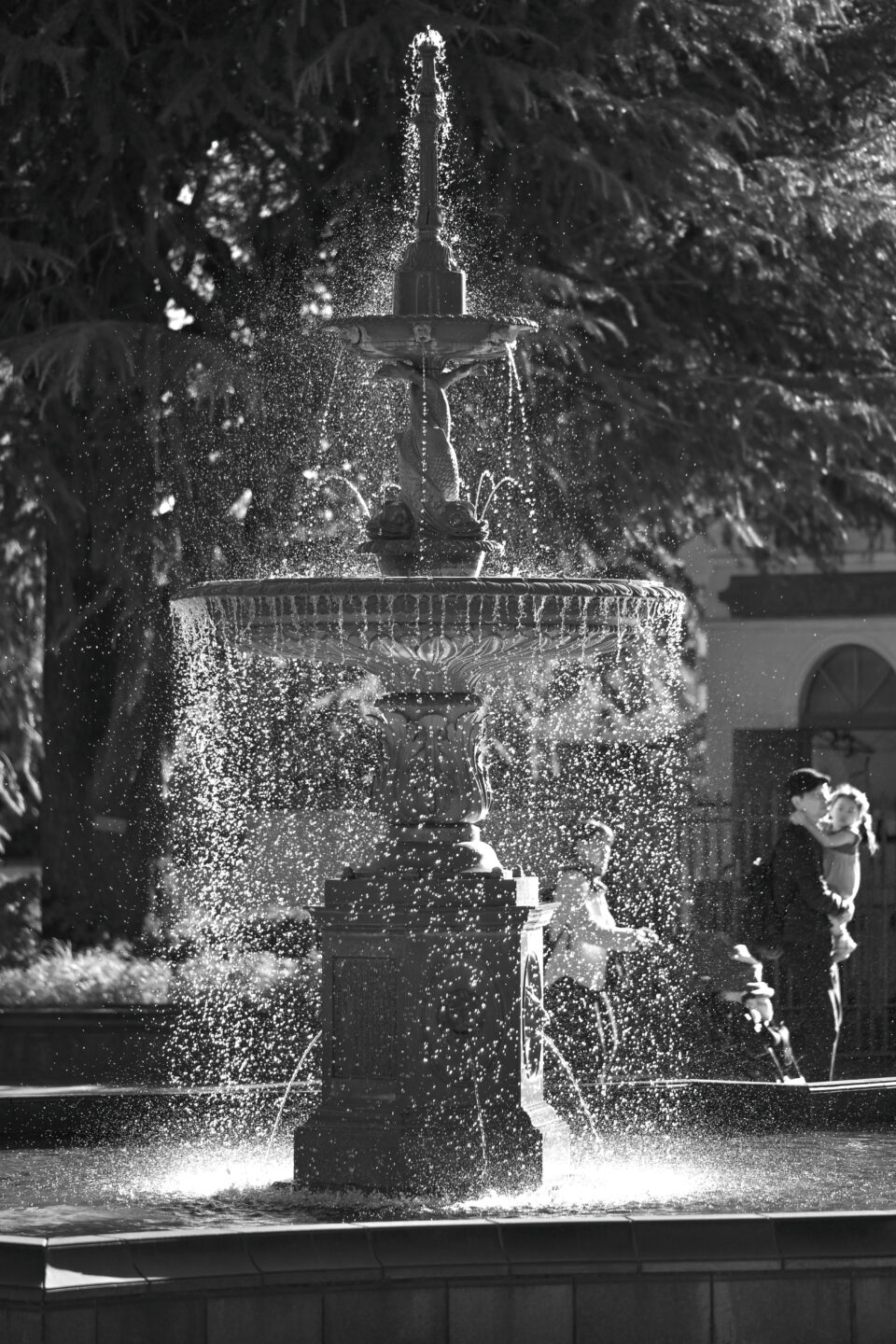 遠くに噴水が太陽の光を受けてキラキラ輝いていました。画角が狭い望遠の特徴をいかして180mmで噴水が樹木と重なるアングルを見つけ、シャドーの中に飛沫の形や動きを強調するように撮りました。彫刻や飛沫がしっかりと描写されインパクトも感じられます。