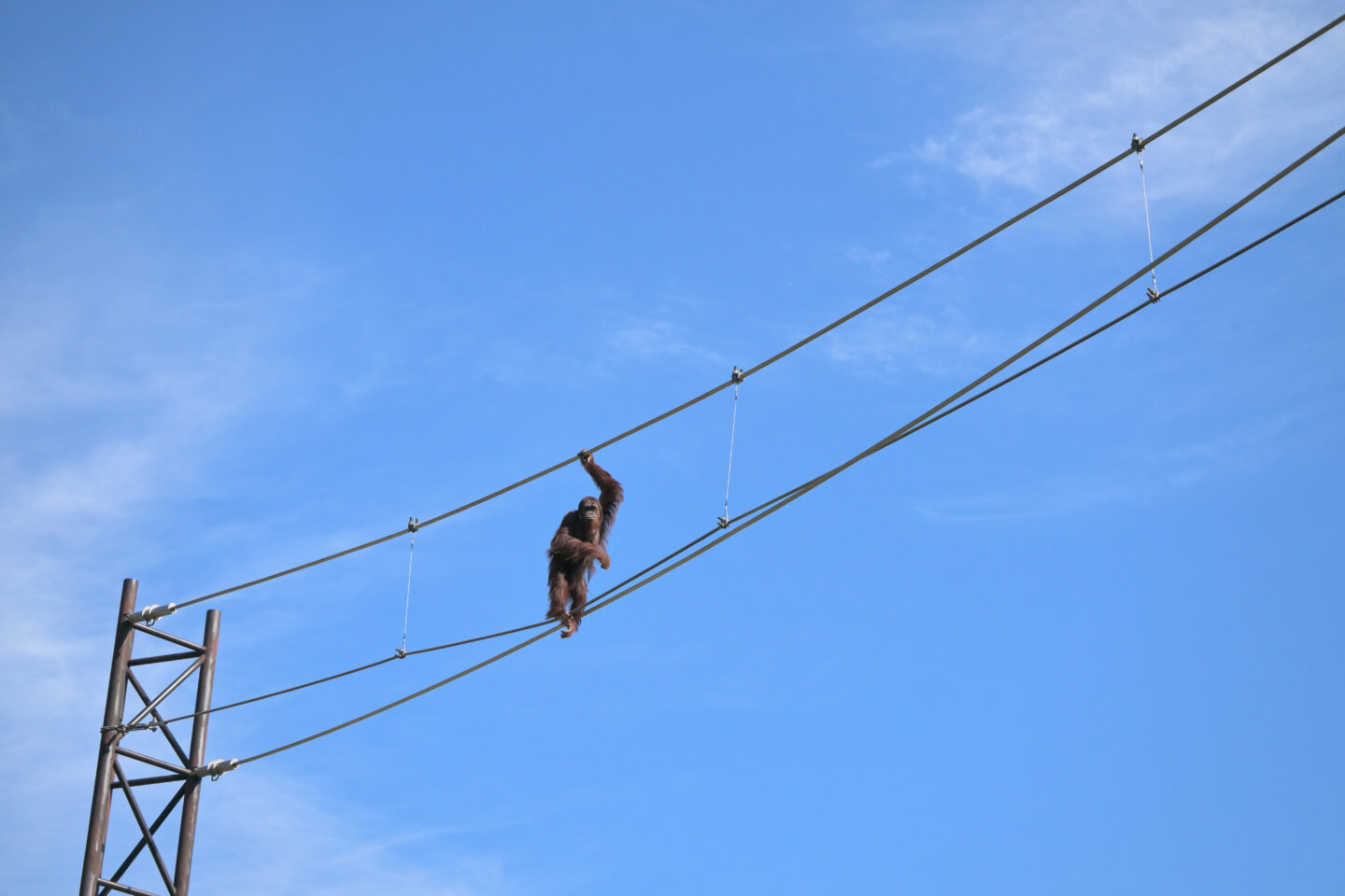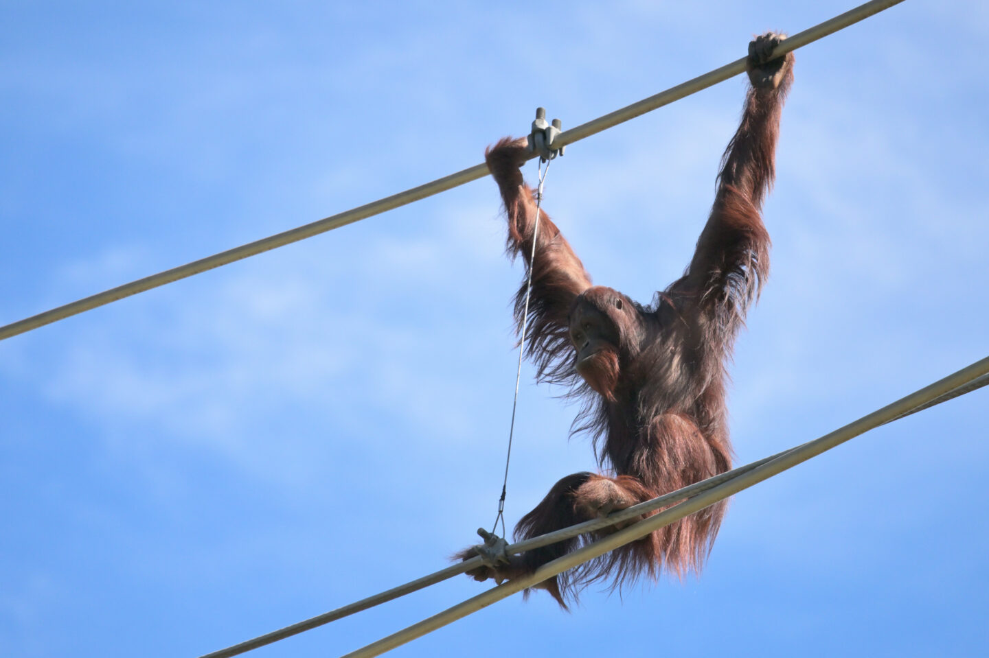 チューバッカを空に発見。長い毛並みと身軽な姿にスターウォーズを思い出しました。実際はオランウータンの空中散歩です。くるりと回転して正面だったり背中だったり、素早い動きで器用に綱渡りして歩いていく様子を連写しました。構図内での被写体は小さいですが、しなやかな筋肉やふさふさの毛並みが豊かに描写できています。70mm側で捉えると空も清々しく、のびやかな景観のある雰囲気になりました。