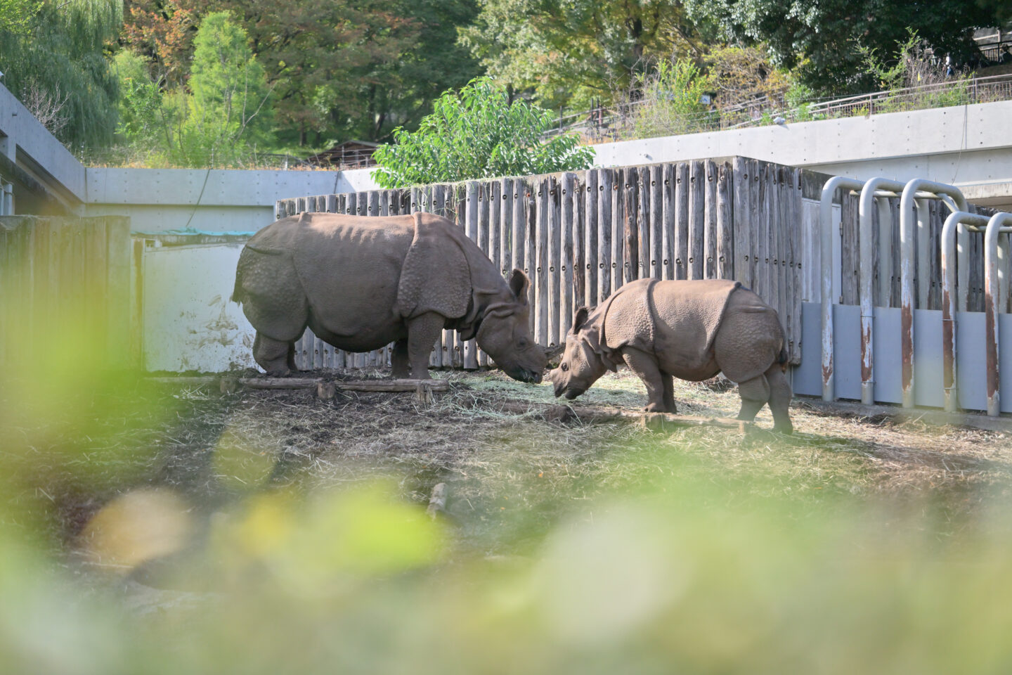 インドサイの親子が陽だまりの中で草を食べていました。穏やかにゆっくりと食べている様子を感じさせるために広い構図にしました。F2.8の効果をいかして植え込みの葉を大きくボかし、光で囲むような表現を加えると優しい雰囲気を演出できました。明るい色で可愛いさもアップしています。