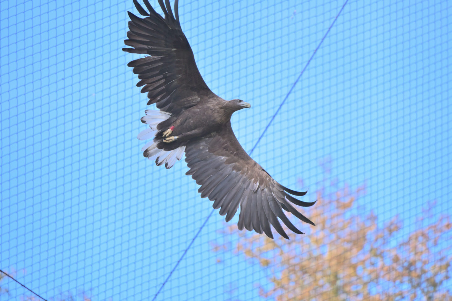 大きな猛禽類がいるバードゲージへ。ここではAF精度と被写体検出の相性を知りたくて、AF-C&3Dトラッキング、被写体検出を「鳥」に設定して、フェンスの外側から飛んでいる瞬間を狙い連写しました。遠景のフェンスは被写界深度の中にあるため残っていますが、鳥の目にピントを合わせて追い続けて撮ることができました。たった1回の撮影ですが、タイムラグを感じることもなく純正レンズと同等の印象です。普段、鳥を全然撮らないわたしでもズバッと撮ることができました。