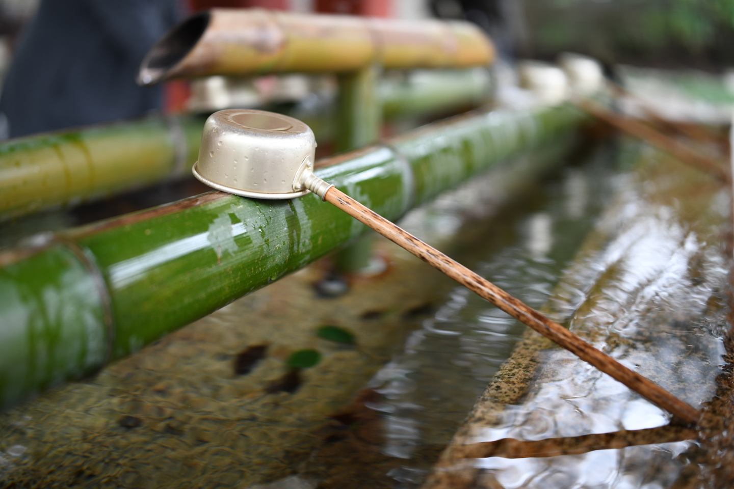 次の作例は絞り開放で手水舎を撮影したものです。柄杓の金属部分と、柄の付け根のあたりにピント位置を合わせて撮影しました。
