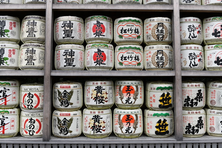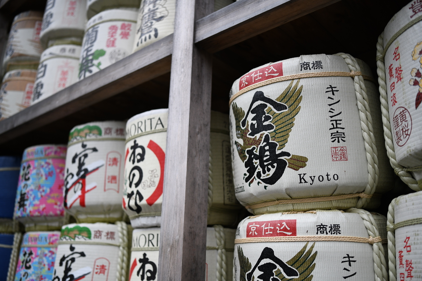 作例は神社に奉納されている酒樽を撮影した写真ですが、右側の酒樽にピントを合わせて撮影しています。