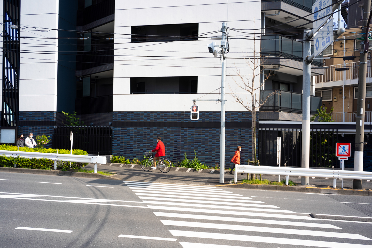 このように瞬間的にいくつもの共通項が組み合わさったシーンを撮れるのもスナップの醍醐味です。赤信号、赤い服を着た2人、右サイドに通行禁止の左を向く看板と、左サイドに右を向く通行人と面白いシチュエーションです。中央の信号の人型マークがこちらを向いているのもいいですね。