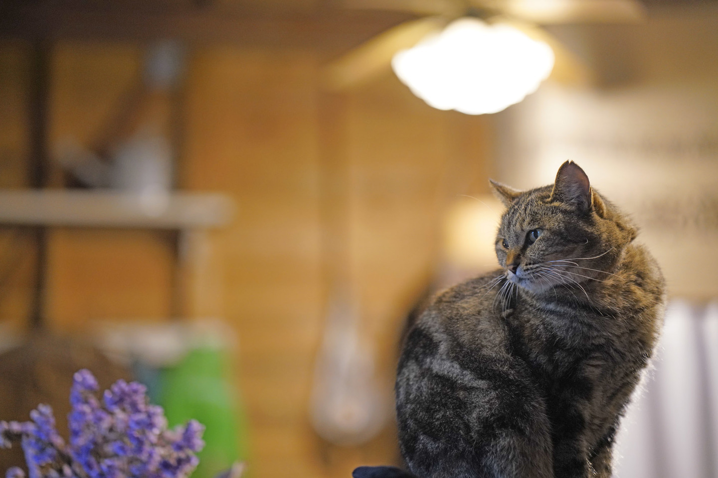 狭い室内ですと、85mmの焦点距離は少し長すぎる感じもしますが、少し広い空間での撮影では、被写体とある程度距離を取ることで構えた写真になりにくく、猫の自然の表情が撮れるメリットがあります。