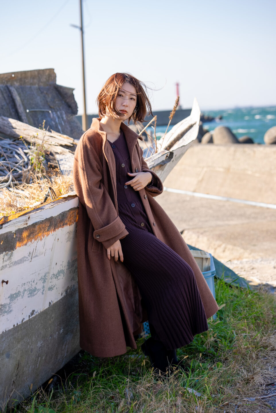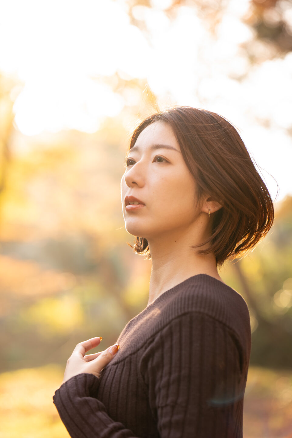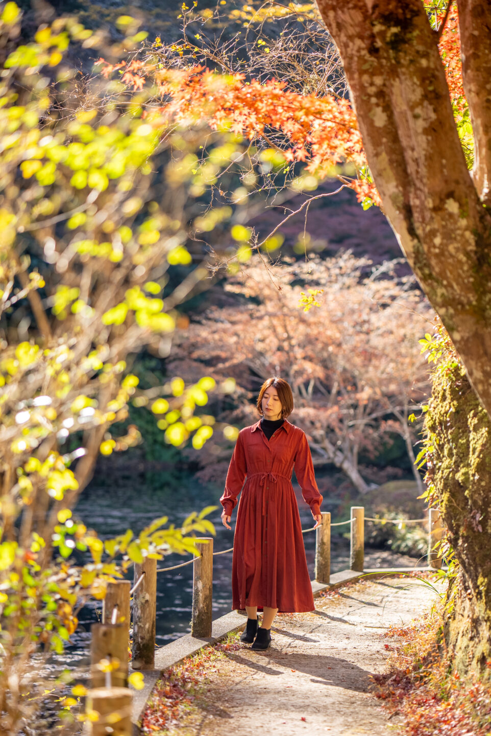 黄金色の葉に囲まれた池のほとりの小径をモデルに歩いてもらう。高度の低い冬の太陽からの斜光が葉を輝かし地面には伸びた影を落とす。あえて離れた位置からカメラを向けて、本格的な寒さを迎える直前の空気感を感じられるようにと撮影した。人物の前後に明るい葉を配置し前ぼけ・後ろぼけを作ることで、木々に覆われた小径の穏やかな心地よさを引き出す。ZEISS Batis 1.8/85が醸し出す柔らかなぼけが優しい。