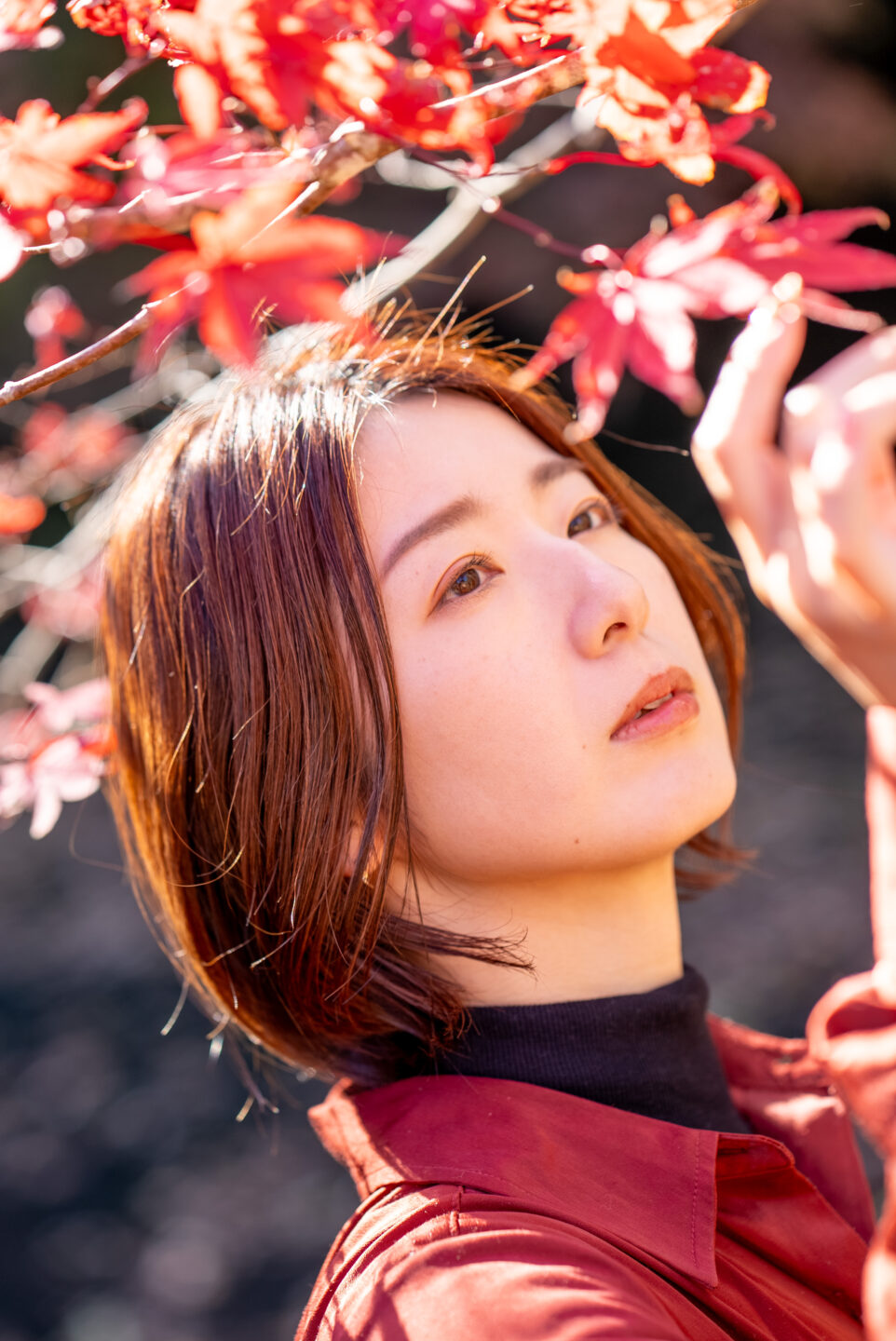 風に舞い散る紅い葉を手に取ったところを、ZEISS Batis 1.8/85の最短撮影距離である80cmまで近寄り撮影。85mmレンズとしては標準的な最短撮影距離ではあるが、クローズアップ撮影時に目立ちやすい諸収差も少なく極めてクリアな描写だ。収差が大きいと画像の雑味に繋がりかねないので、開放絞り値付近を多用するポートレート撮影では素性の良いレンズを積極的に選びたい。