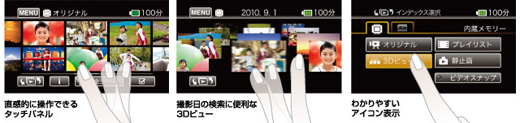 撮りたい被写体にタッチして素早くピントや露出を合わせたり、再生時にはサムネイル画像を指でなぞってスクロールできるタッチパネルを搭載。モードや機能 の選択もアイコンにタッチするだけ。サムネイル画像を立体的に表示する「3Dビュー」は、撮影日の検索もスムーズに行えます。直感的に楽しく操作できる タッチパネルです。