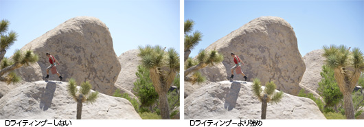 逆光時の撮影など、輝度差の大きな被写体でも、白とび、黒つぶれの両方を抑えながら適度なコントラストを保ち、見た目に近い明るさを再現するアクティブ D-ライティング。D7000では新しい画像処理方式の採用により、効果の度合いを高めても優れた色再現性を維持しつつ、高速で画像処理を行います。効果 の度合いは[オート][より強め][強め][標準][弱め][しない]から選べ、最大3コマまでのブラケティング機能も備えています。