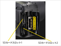 SDメモリーカードを2枚使用できるダブルスロットを搭載。1枚目のカードに空き容量がなくなったら自動的に2枚目のカードに記録する「順次記録」、同じ 画像を2枚のカードに記録する「バックアップ記録」、RAW画像とJPEG画像をそれぞれのカードに記録する「RAW+JPEG分割記録」が選べます。ま た、カード間で記録画像をコピーしたり、メモリーカードの空き容量を考慮して動画の記録先を指定したりもできます。SDXCメモリーカードにも対応しています。