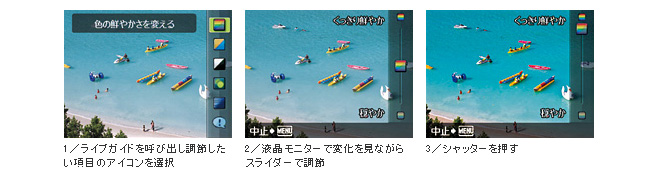 カメラを被写体に向けるだけで最適な撮影モードで撮影できる「iAUTO」に、背景をぼかす事はもちろん、動きを止めたり、鮮やかさを変更したりといった一眼カメラならではのオリジナリティあふれる表現がどなたでも簡単に行える「ライブガイド」を搭載しました。3ステップでライブビューを見ながら直感的に操作できるので、撮りたい写真が思い通りに撮ることができます。