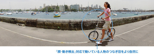 従来の「スイングパノラマ」ではカメラをひとふりする間に高速連写した膨大な静止画を等間隔でつなぎ合わせていましたが、「スイングパノラマ(顔・動き検 出対応)」では人物を検出すると、その部分の静止画の間隔を自在に変えてつなぎ合わせます。これにより、人物がより自然に写ったパノラマ写真を撮影できます。