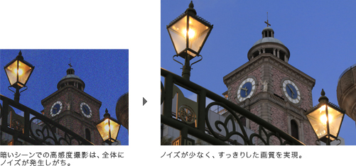 少ない光量でも粒状感を軽減。オートでもISO80~1600まで自動調整するので、撮影シーンがさらに拡大します。