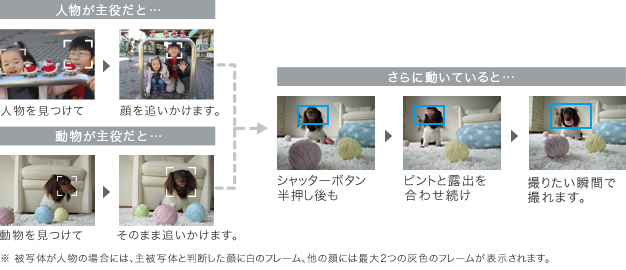 カメラが主役となる被写体を自動で判断して、ピントと露出を合わせます。人物はもちろん動物や乗り物にも対応。一度ピントを合わせたら、そのあと被写体が動いても追いかけ続けます。