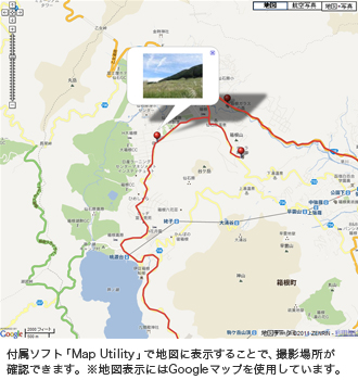 撮影時の位置情報を、画像データとともに記録・確認可能。カメラ上部の受信部が衛星からの信号を自動受信し、位置情報を細かく測位します。付属ソフト「Map Utility」を使えば、撮影ポイントの地図表示が可能です。