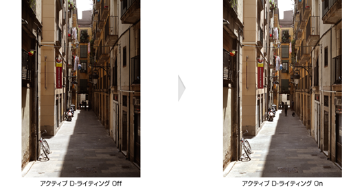 光と影を自由に楽しむことができれば、シャッターチャンスはもっとひろがっていきます。 アクティブD-ライティングは、逆光などのコントラストが高い被写体を補正する機能です。撮影する場所や被写体に合わせて露出を調整し、ハイライト部分の 白とびやシャドー部分の黒つぶれを抑えることで、適度なコントラストを保った画像を再現します。太陽に映える白いシャツのディテールも、日陰で微笑む恋人 の表情も、見たままに近い自然な印象で描き出します。
