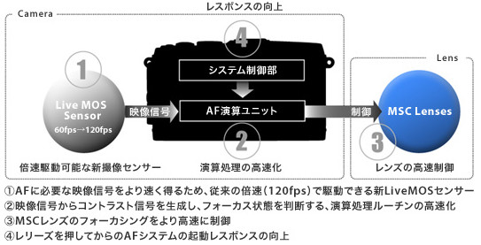 新AF「FAST AFシステム」は、Live MOSセンサーの駆動速度/AF演算処理スピード/レンズ制御/システム制御など全てを見直すことで、従来比約3倍・位相差AFも超える世界最速 ※1のAFを実現しました。