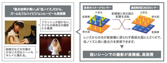 1600万画素裏面照射型CMOSセンサーを搭載。従来のCCDよりも集光率に優れ、低ノイズだから、夜景など暗いシーンの写真を美しく高精細に撮影できます。また高速処理により連続撮影も快適に楽しめます。