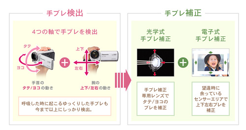 手首のタテ/ヨコの動きによる手ブレに加え、腕の上下/左右の動きによる手ブレまで検出する、4 軸の手ブレ検出を採用。さらに補正時には、光学式と電子式によるダブルのブレ補正を行うことで、ズーム撮影時に気になっていた細かなブレまで抑えることが できるようになりました。さらに光学式手ブレロック機能を搭載し、手ブレ補正効果がさらにアップ!ブレやすいズーム時で特に効果を発揮します。固定したアングルで撮りたい場合、安定した構図を保つことが可能となります。