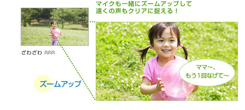 映像のズーム操作に連動して、マイクもズーム。周囲が騒がしい場所でも、ズームアップした被写体の声や音を集中して捉えます。