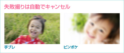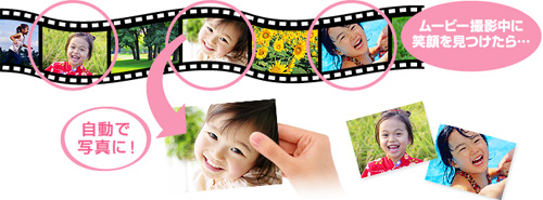 ムービー撮影中に笑顔を見つけたら、写真に自動で同時記録する機能。 さらに、手ブレやピンボケなどの場合は自動で記録をキャンセル。キレイに撮れた笑顔だけをしっかりと記録し、記録メディアの無駄使いをさせません。