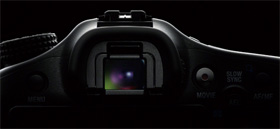 世界初(*)の有機ELを採用した、高解像度・高コントラストの電子ビューファインダー「XGA OLED Tru-Finder」を搭載。「XGA OLED Tru-Finder」だから実現できる約235万ドット相当の圧倒的な解像度、自発光方式ならではの忠実な黒を再現する高コントラストで、被写体の細部 に至るまで表示。画面を拡大しての微細なピント合わせにも威力を発揮します。また、動く被写体を追っても残像ブレを感じさせない応答性など、フレーミング のしやすさが格段に向上。また、視野率100%はもちろん、視野角約33.3°、ハイアイポイント約27mmなど、フラッグシップモデルのα900に匹敵 する見やすさを実現した高性能電子ビューファインダーです。