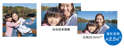 「Gレンズ」に加え、16:9の「“Exmor R” CMOSセンサー」を採用することで、ワイド端で、動画でも静止画でも26.3mm(*1)というひろびろワイドな広角撮影を楽しめます。室内での大人数 のパーティなど、後ろに下がれない場所での撮影や、建築物・風景の描写に大活躍。撮りたいもの全体をしっかりと画面の中に納められます。