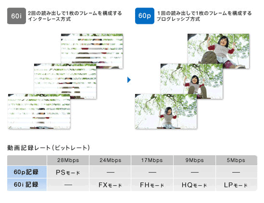 2回の読み出し時間をかけて1フレームを構成するインターレース方式に比べて、1回の読み出しで1フレームを構成するプログレッシブ方式。プログレッシブ方式は時間当たり約2倍の情報量なので、より高精彩な記録を実現します。