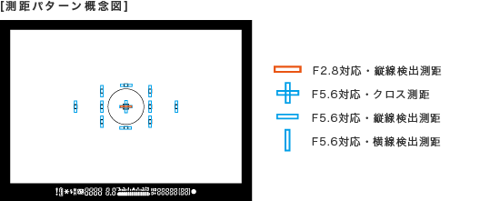 EOS 6Dのために新たに開発した11点AFセンサー。使用頻度の高い中央測距点には、高精度なF5.6対応のクロス測距とF2.8・縦線検出測距を配置しました。また縦長のF5.6対応センサー全体を使うことで、大デフォーカス(大ボケ)状態からでも迅速な被写体検出が可能。さらに、AFセンサーの画素構造の改良と、中央測距点でのAFセンサーの受光面積を増やすことで感度アップに成功。低輝度限界-3EVを実現しました。