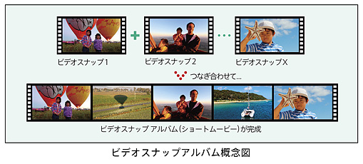 撮った動画の編集を楽しく、快適にしてくれるビデオスナップ機能。スナップ写真感覚で撮った短い動画(シーン)をつなぎ合わせて、1つのショート ムービーが作成できます。アルバムの設定はかんたん。ウィザード風形式で、項目を選択しながら操作することができます。また1シーンの撮影時間は、[約 2/4/8秒]*から選択。 を押して撮影をスタートすると、設定した時間で自動的に撮影が終了します。[撮影をしない]や秒数を切り替えるなどの動作を行うと、新規のビデオスナップアルバムとして保存。保存されたアルバム内のスナップの入れ替えや削除もかんたんに行えます。
