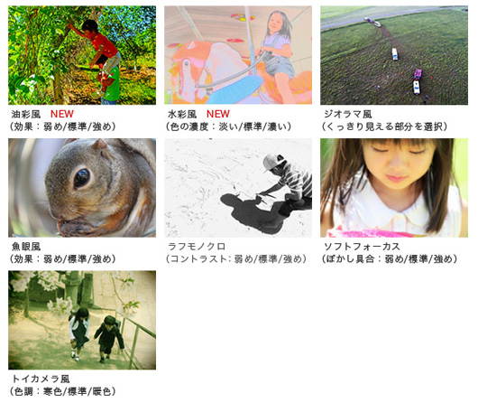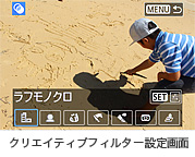撮った写真を処理して、印象的な作品に仕上げる[クリエイティブフィルター]。新たに「油彩風」と「水彩風」を加え、全7種に。カメラ内で処理することができ、新しいファイルとして保存できます。撮影した写真の記録画質がRAWとJPEG(全種類)に対して処理を行うことができます。