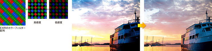 EXRのカラーフィルター配列を活かし同色の2画素を混合することで受光面積を拡大したEXR技術と、高感度な裏面照射型CMOSセンサーにより、高感度撮影時にもノイズの少ない画像を実現。しかも、進化した"EXR CMOS"センサーでは受光効率がさらに向上し、ノイズを約30%も低減することに成功しました。高感度撮影時にも暗部のノイズを徹底して抑え、クリアで自然な明るさが得られます。