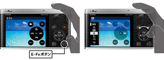 E-Fnボタンを押すと、背面各ボタンの割り当てが切り替わり、それぞれ別機能が呼びだし可能に。より多くの機能へダイレクトにアクセスできます。モニター上に各ボタンの割り当てが分かりやすく表示されます。フィルムシミュレーション、ホワイトバランス、ISO感度など14項目の機能を6つのボタンに割り当てることができます。