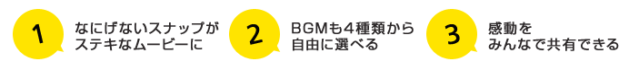 動画の躍動感を静止画に組みこんだ新しい映像表現。それが「モーションスナップショット」です。シャッターボタンを押すと、カメラが静止画と約1秒の動画を同時に撮影。再生時には、その動画を2.5秒に引き延ばしたスローモーションと静止画を合わせた映像作品をオリジナルBGMとともに鑑賞することができます。撮影した作品はSNSでシェアしたり家族や友達へのビデオレターやグリーティングカードとして使うことで、よりいっそう楽しみが広がります。また、カメラ内でスローモーション部分を連続再生して、編集作業をすることなくドラマチックなムービーを楽しむことも可能。付属のソフトウェア Short Movie Creatorを使えば、スローモーション部分の動画ファイルをつなぎ合わせて、連続再生の1つの動画ファイルをカンタンに作成することもできます。